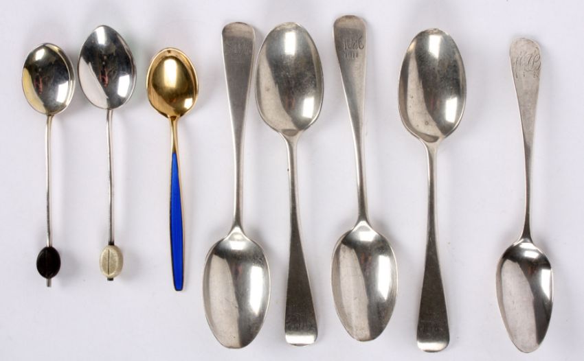An Edwardian set of four silver teaspoons, Sheffield 1905by CW Fletcher & Co Ltd, together with two silver and enamel coffee spoons, Birmingham 1932, a silver teaspoon, Newcastle 1800's and a Norwegian silver gilt teaspoon, (8) 4 ozt approxCondition: Good condition with wear to bowls