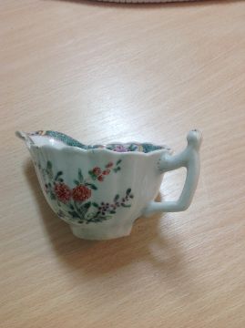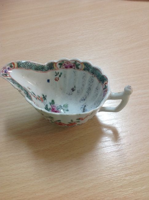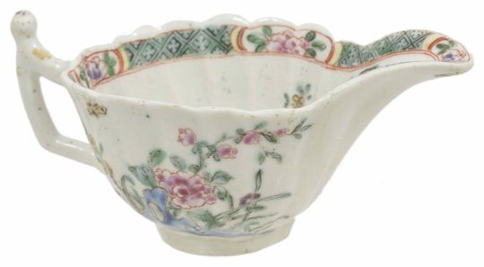 An early Worcester porcelain cream boat, circa 1753with scalloped edge, the interior has hatched band with flower heads, the exterior painted with flower heads amongst leaves height 5 cm, length 11 cm Condition: With a chips to the rim of the bowl near the spot, fire marks apparent with pitting.