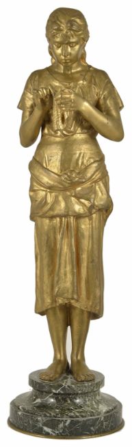 Alphonse De Tombay (Belgian 1843 - 1918)'La gardeuse d'oies tricotant' a gilt bronze sculpture of a standing female knitting, raised upon a stepped socle green marble circular base with a gilt metal rim to the base, signed to the reverse Alp de Tombay Usines Vojave, Ste Arne, Bruxelles total height 59.5 cmCondition: Overall condition is good with obvious wear to the gilding, stain mark over the signature on the reverse