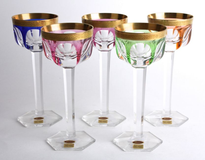 A set of five Mosers glass wine glasses, 20th century,the bowls with gilt incised band above fluted coloured glass, upon hexagonal tapering stems with hexagonal feet, each bears oval labels (5) height 19 cm Condition: Condition is good with obvious wear to gilding