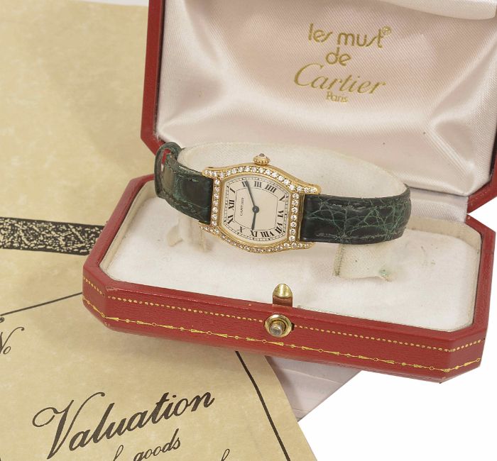 A Cartier Tortue 18ct yellow gold and diamond Ladies wristwatchthe champagne dial with roman numerals surrounded by a diamond yellow gold mount bezel, Cartier crystal crown, with green Cartier strap and plated buckle, case back engraved Cartier Paris, No.960700057, manual wind movement, with service and valuation records in a les must de Cartier red box and bag Case diameter 22mm; Lug width 11mmCondition: Good condition with wear to the strap, scratches to case, has not been tested; from service record the crystal was replaced in 2006 when the watch was serviced by Cartier