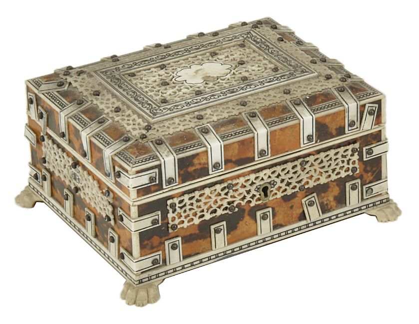 An Indian Vizagapatum style box, 20th centurywith bone banding and filigree work upon tortoiseshell, raised upon claw supports. 6.5 x 13 x 10.5 cmCondition: Good condition, some of the banding broken