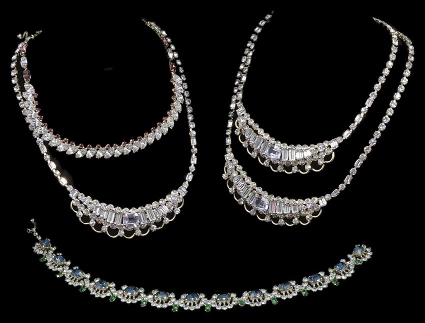 Christian Dior by Mitchel Maer 1954-1957A collection of 1950's 'Christian Dior by Mitchel Maer' couture jewellery A blue and green rhinestone collar/necklace, together with three aquamarine rhinestone baguette set necklaces of the same design and a marquis aquamarine and amethyst rhinestone necklace (5) All labels removed overall length of blue/green collar necklace 29 cmCondition: All labels have been removed. All in good orderThis collection of Christian Dior jewellery was purchased by the current vendor's father-in-law as part of Mitchel Maer's liquidated stock sold at auction following his bankruptcy in 1957. Christian Dior insisted that the Dior name plaques were removed from each item of jewellery prior to the sale as Maer no longer held the Dior license for jewellery production in the U.K.
