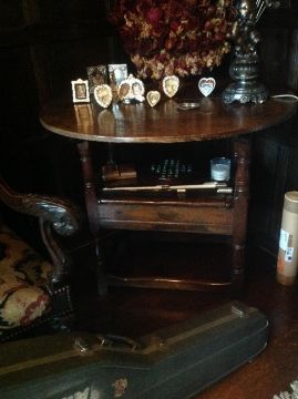 An Oak metamorphic table/seat, late 18th/early 19th century,the circular top above two arms with turned supports over a hinged seat, upon turned stretchered block supports height 79 x 89 cmCondition: Good condition with wear to the table top and seat