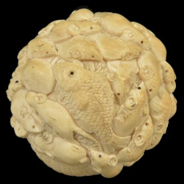 An early 20th century carved Japanese ivory 'rat ball' okimonowell carved as rats clambering over a basket of carp and each other, some with hardstone bead set eyes diameter approx. 6.5 cmCondition: Majority of eyes missing, slight crack to lower basket