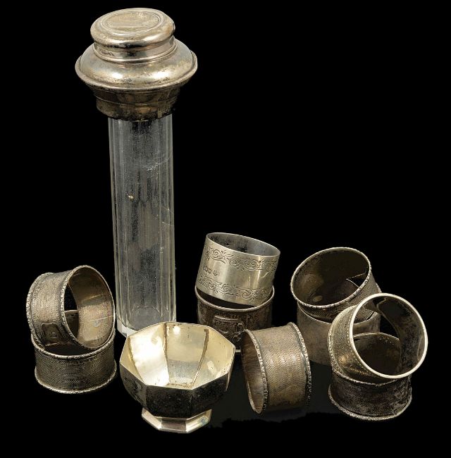 An assorted collection of silver table wear and otherscomprising nine napkin rings (five from a set), a small silver Continental cream jug with embossed decoration of vignettes with enclosed cherubs stamped 800, glass dressing table jar with no lid of cylindrical form, a 1930s salt, Thomas Bradbury and Sons (qty) Condition: All with wear, some with dents.Provenance: From the estate of the late Patrick Thomas Corrie Lewin