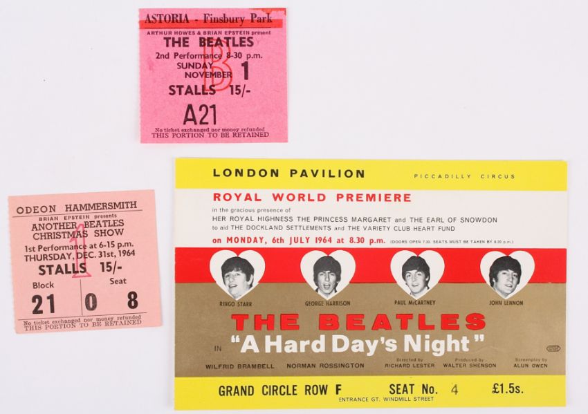 An interesting collection of five Beatles programmes together with three tickets and one photograph,the first programme for the Royal World Premiere of "A Hard Day's Night" at the London Pavilion on Monday 6th July 1964 in the presence of Princess Margaret and The Earl of Snowden together with the original ticket; the second is a souvenir programme for "The Beatles Christmas Show" at Finsbury Park Astoria from Tuesday 24th December 1963 to Saturday 11 January 1964 together with a ticket stub from a Beatles performance on Sunday November 1st at the Astoria, Finsbury Park; the third programme is from "Another Beatles Christmas Show" at the Hammersmith Odeon from Thursday 24th December 1964 - Saturday 16th January 1965 together with associated ticket stub from the show on Thursday 31st December 1964. The fourth programme is for The Beatles "A Nationwide Tour" featuring Mary Wells and the fifth programme is from "The Great Pop Prom" which was held at The Royal Albert Hall on 15th September 1963 and featured The Beatles along with other artists including the Rolling Stones.; together with a photograph of Paul McCartney. "A Hard Day's Night" programme 28cm high by 21.5cm wide.Condition: The "A Hard Day's Night" programme is in reasonably good condition although some creasing to the cover, the associated ticket has pencil writing on the back top right corner. "The Beatles Christmas Show" programme also in reasonably good condition although some creasing and marks to cover, ticket stub in good condition. "Another Beatles Christmas Show" programme in reasonable condition with marks over front cover, associated ticket stub in good condition. "A Nationwide Tour" programme in fair condition although central staples coming loose and small tear to bottom left hand corner of cover. "The Great Pop Prom" programme in fair condition with creasing to front and back cover and small tear to front cover and first page.