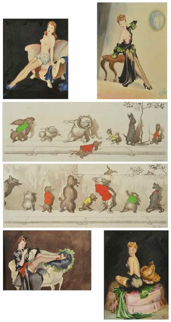 Arthur Boris O'Klein (French 1893 - 1985)'The Dirty Dogs of Paris', two coloured etching of comical dogs, entitled 'A la Queue' and 'Sus aux Curieux', both signed in pencil lower right, each mounted in a gilt frame, together with four 1930's watercolour and pencil Female figurines, signed RH Vigor, (6) 59.5 x 33.5 cm framedCondition: Nice condition for the six items, frames good, edges of loose slightly worn
