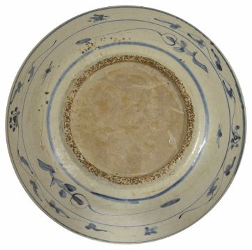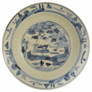 A large Chinese late 17th/18th Century Swatow blue and white pottery chargerthe centre painted with a pair of deer resting in a wooded glade, the outer rim painted with a continuous land and river scape with boats diameter 36 cm approx.Condition: Overall good