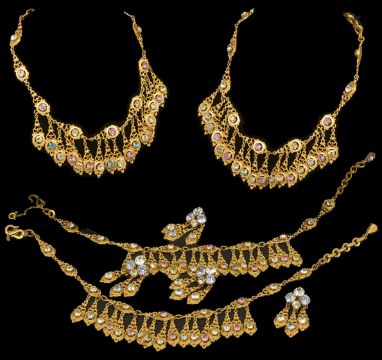 Christian Dior by Mitchel Maer 1954-1957A collection of 1950's 'Christian Dior by Mitchel Maer' designer jewellery of the same designFour pierced and gilded Egyptian style fringe necklaces set with multi coloured pastel rhinestones in pink, turquoise, green and white and with adjustable chain fastening, together with two pairs of matching drop earrings, labels removed (6) fringe drop measures 4 cm, necklace drop measures 15 cmCondition: All labels have been removed. Overall good condition for each itemThis collection of Christian Dior jewellery was purchased by the current vendor's father-in-law as part of Mitchel Maer's liquidated stock sold at auction following his bankruptcy in 1957. Christian Dior insisted that the Dior name plaques were removed from each item of jewellery prior to the sale as Maer no longer held the Dior license for jewellery production in the U.K.