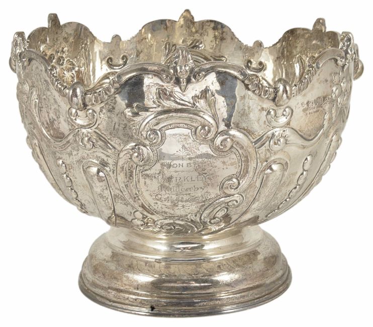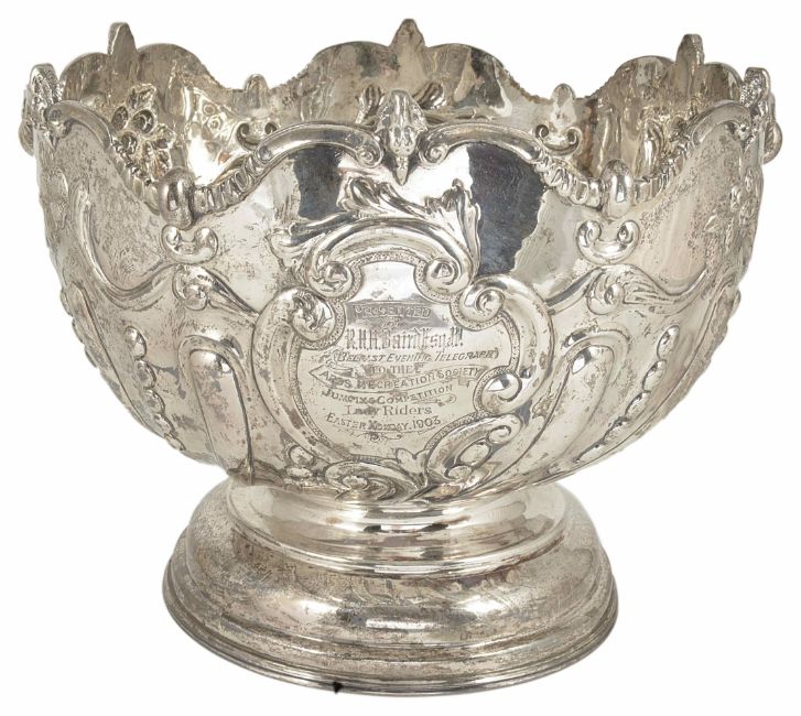 An Edwardian silver monteith, Chester 1902, of large proportions with scalloped edge above part gadrooned body, enclosing two scrolled shields engraved 'Presented by RHH Baird Esq. Belfast Evening Telegraph to the Ards Recreation Society Jumping Competition Lady Riders Easter Monday 1903' and on the reverse 'Won by Berkley, Ridden by G M Higgin', raised upon a circular waisted foot ring, George Nathan & Ridley Hayes, Retailed by Gibson LTD Belfast, weight 40 ozt approx; height 20 cm approx.Condition: Condition is good, marks clear, tarnishedProvenance: From the estate of the late Patrick Thomas Corrie Lewin