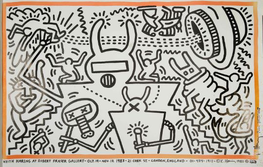 Keith Haring, (American, 1958-1990) Keith Haring at Robert Fraser Gallery London, October 19th - November 12th, 1983, comical figural printed poster, signed 'K Haring for Richard' 101.5 x 67 cmCondition: Condition is fair to good with foxing on lower right, six pin holes on border