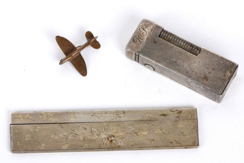 A silver plated Dunhill flip top lighter and engine turned decoration, engraved with initials RP and the message To Dad, a wartime plane 'sweetheart' pin together with a white metal mounted travelling comb with engraved foliate scroll decoration (3) comb measures approx. 11 cm.Condition: Brooch back pin bent out of shape