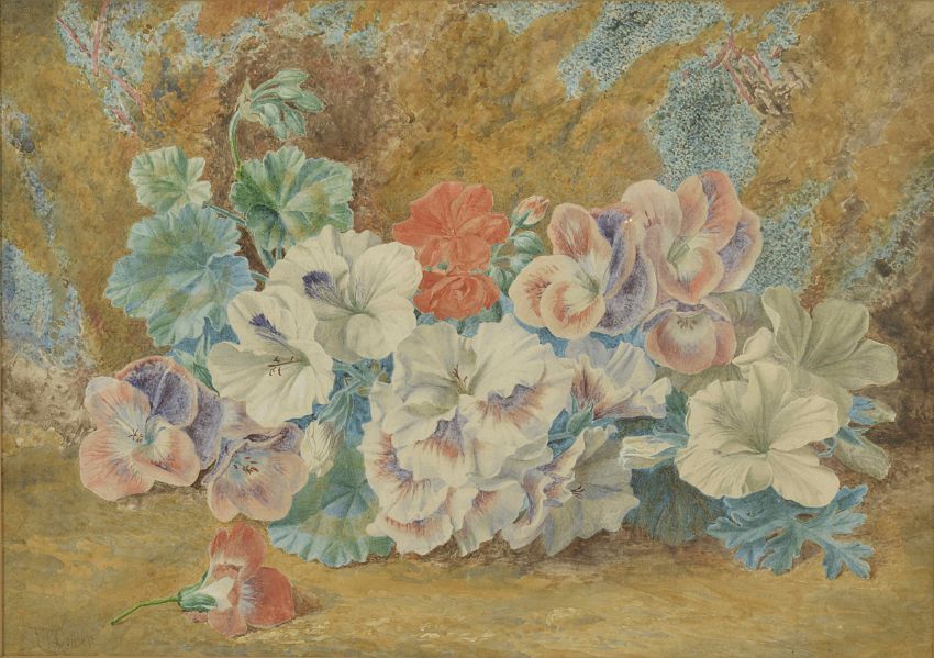 Thomas F Collier, (British 1840 - 1891)watercolour of 'Pelargoniums' in a gilt frame, signed lower left in pencil height 44 cm, width 55 cm in frameCondition: Condition is good, faded slightly