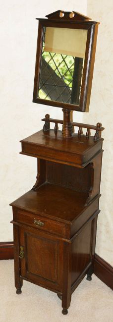 A gentleman's oak shaving stand and cupboard, 20th centurythe rectangular oak frame with mirror inset raised upon an adjustable rod, above the hinged section over a single drawer and cupboard upon turned supports height 152 x 36 x 35 cmCondition: Good condition with wear throughout