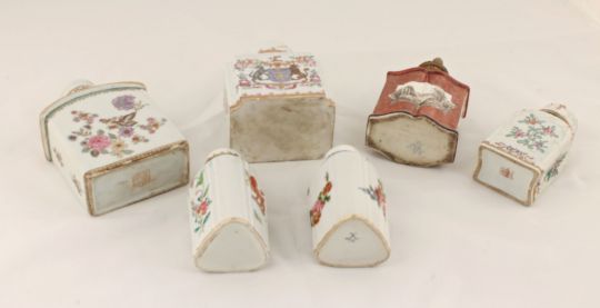 A collection of six European porcelain tea canisters, 19th century and latercomprising of a Sevres porcelain tea canister, early 20th centuryof triangular form, with painted colourful sprays, crossed swords to base and a further similar example, two Samson porcelain rectangular tea canisters with covers, each with painted armourials and foliate decoration, 19th century, a Sevres style porcelain tea canister with red ground and panel landscape scenes and a porcelain tea canister with foliate sprays (6) height of tallest 13 cmCondition: Condition is fair to good with wear to paintwork and gilding,