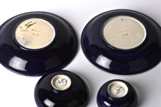 A pair of William Moorcroft Anemone pattern tube lined dishes, 20th century,of circular dished form with dark blue ground and central flower head, together with two small bowls in Anemone patterns, impressed and painted marks to bases, (4) dishes: 18 cm diameter, 3 cm high; bowls: 4 x 11 cm, 3.5 x 8 cmCondition: Good condition to each item