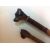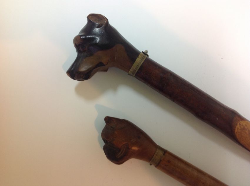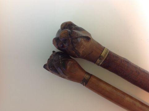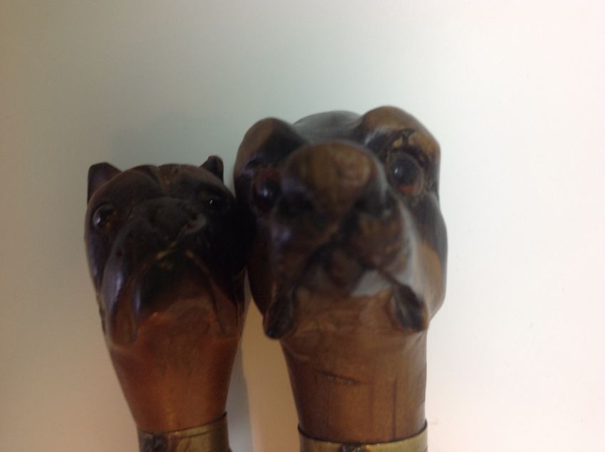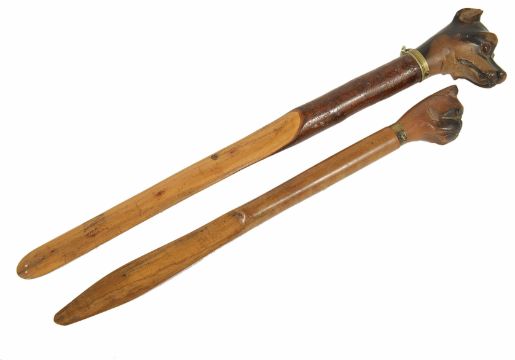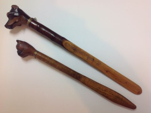 Two dog mounted treen paper knives the first with carved head of a pug, the other with carved head of terrier, both with glass eyes and brass collars, (2) length of the longest 32cmCondition: The pug with one chipped eye and very light general wear but no major damage. The other with General wear but in good overall condition.