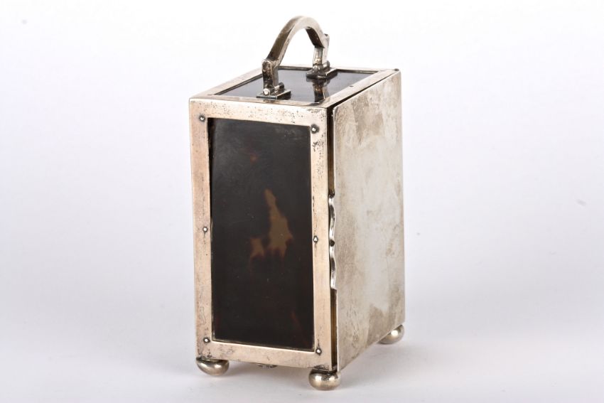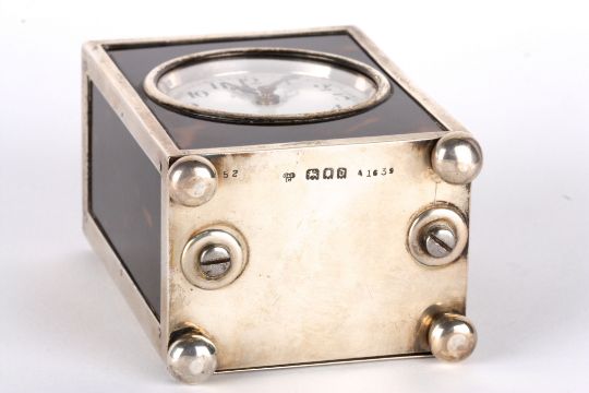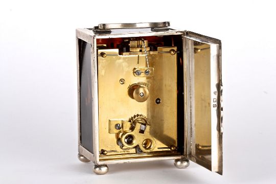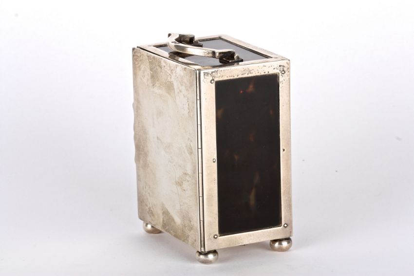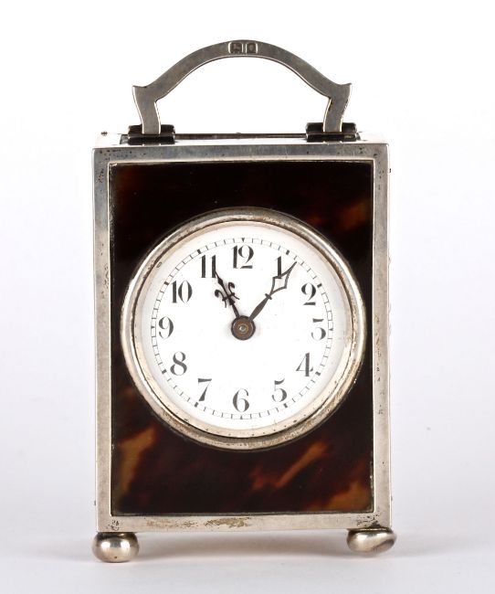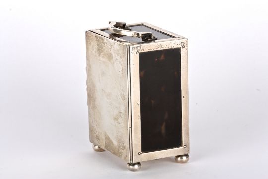 An Edwardian silver and tortoiseshell carriage clock, London 1918of rectangular form with French movement, the tortoiseshell panels banded with silver, the central enamel dial with roman numerals and strap work hands, raised upon bun supports, with swing handle, Charles and Richard Comyns, case no.41639 height 9 x 6.5 x 4.6 cmCondition: Good clean condition with wear to silver and tortoiseshell, back door does not close fully, bun feet dented, tortoiseshell slightly scratched