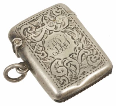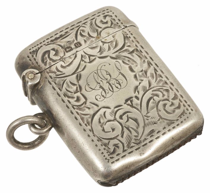 A silver vesta casehallmarked Birmingham, 1919the hinged case with engraved decoration, and suspension loop length 3.8 cmCondition: Denting but in fair condition