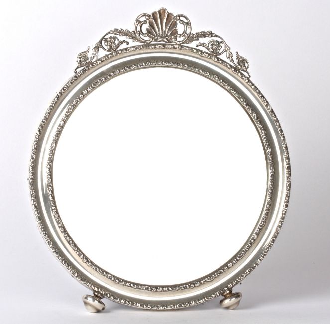 An Edwardian silver framed dressing table mirror, Birmingham 1908with scallop shell and foliate tendrils above a circular scroll embossed frame upon bun supports, Henry Matthews height 28 cmCondition: Nice condition with wear to hallmarks