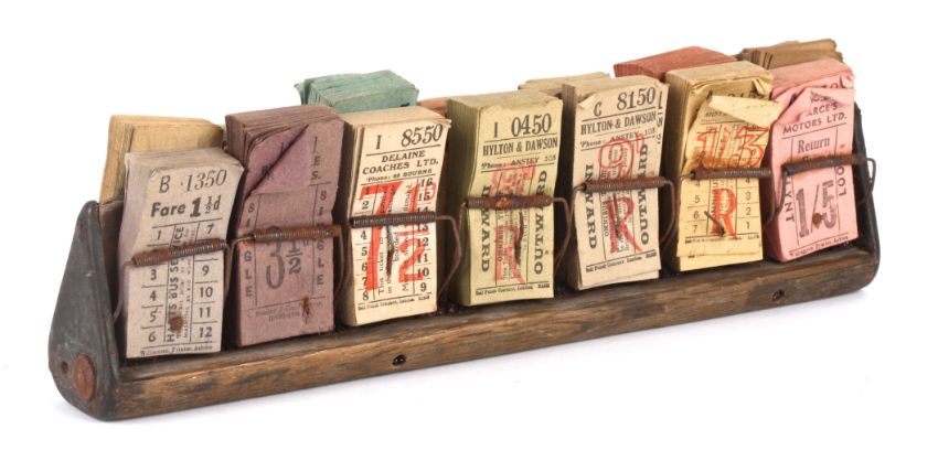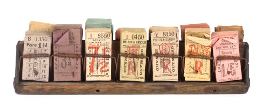 A collection of various coloured bus tickets in wooden stand. Dating from post-war, no later than 1950's/1960's. stand length 28.5 cm approximately.Condition: Fair condition.