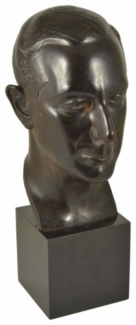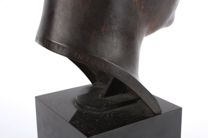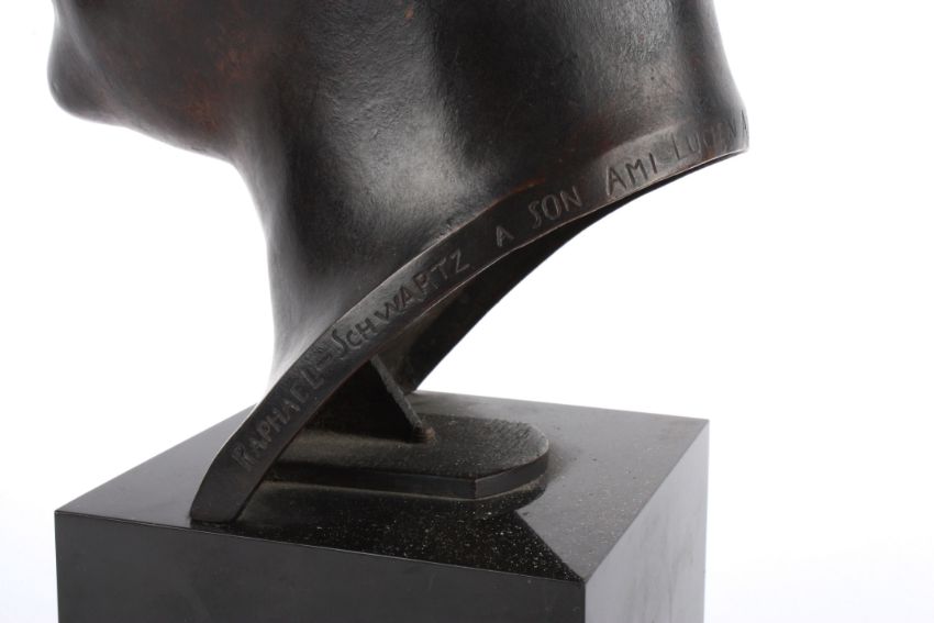Raphael Schwartz (Russian 1874 - 1942)a bronze bust of Gentleman, on a rectangular marble base, 20th century, base rim of bronze inscribed 'Raphael Schwartz - A son am I Lucien Albisetti en toute cordia lite 8-1-42', no foundry marks, height 49 cm total Condition: Condition is good with obvious wear throughout, worn patches can be seen