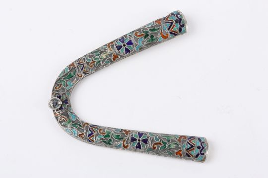 A Russian cloisonne enamel and silver icon partcirca 1890with coloured enamels throughout in geometric shapes, with suspension loop length 9.5cmCondition: This is clearly part of something, possibly part of an icon. It is rubbed and on the reverse, with minor chips to the enamel on the front, but generally in fair to good condition
