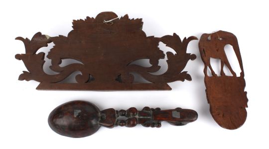 A tribal wooden spoon wall hanging, 20th centurytogether with a Modern tribal wooden elephant and face wall hanging and an oak carved basket of fruit with acanthus leaves overmantel (3) Condition: Good condition and patination to each item, the oak carving from a larger item originally