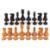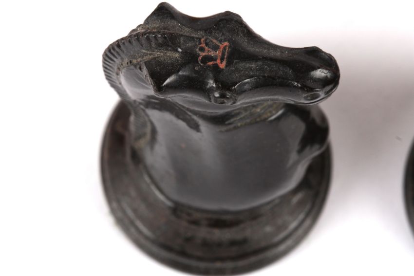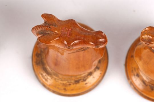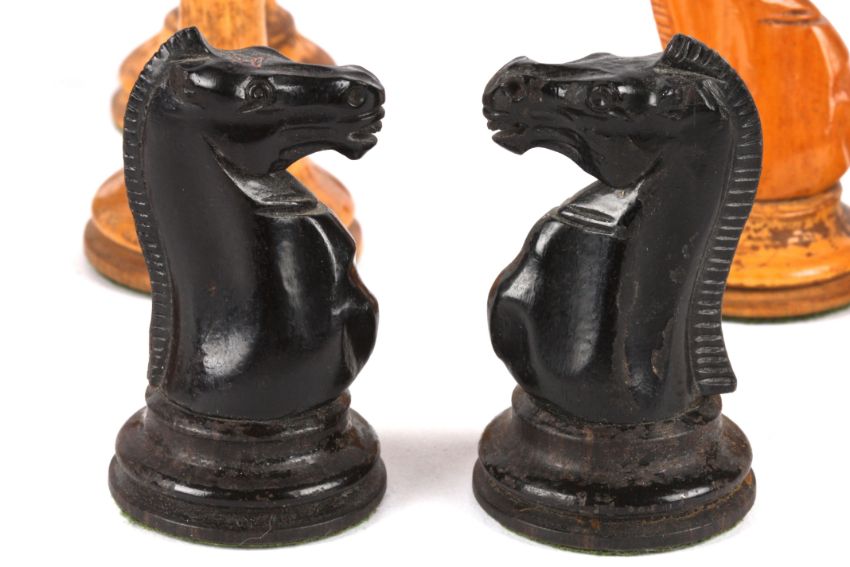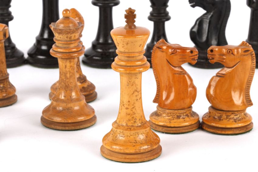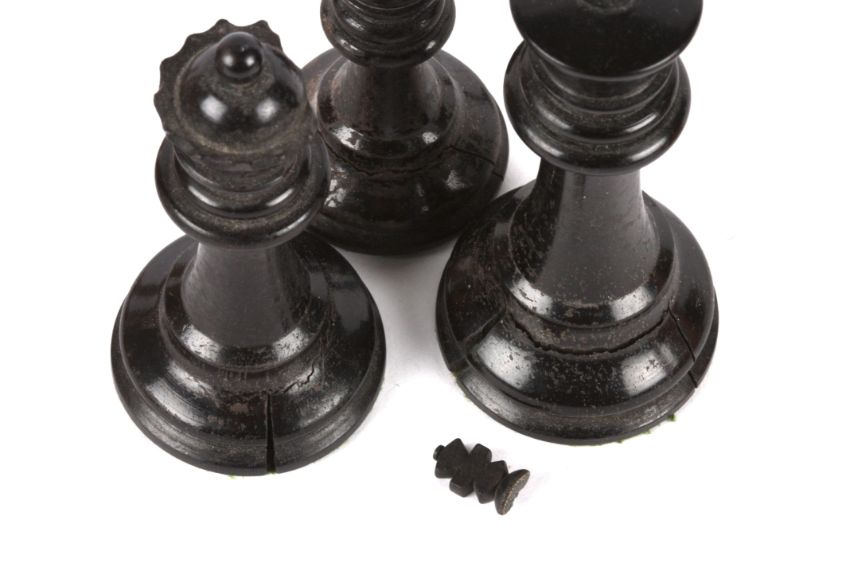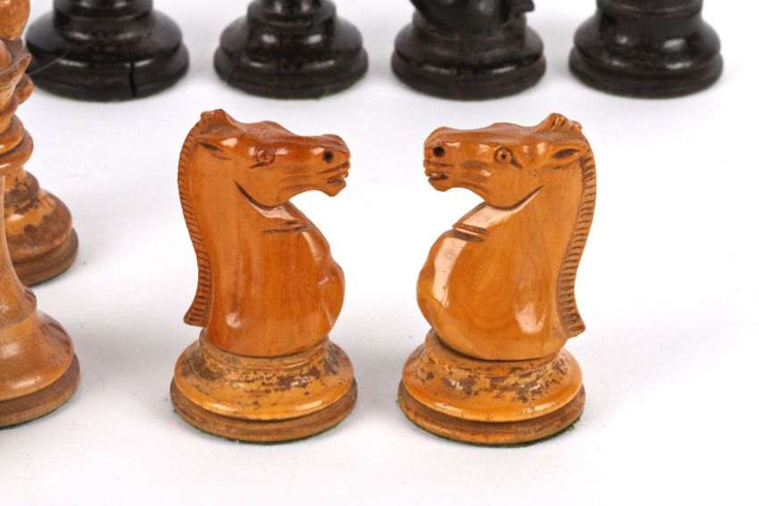 A harlequin set of Jaques Staunton style chess pieces, early 20th century comprising of boxwood and ebony pieces, two rooks and two knights bear red crown mark, (A/F) (32) king: 11 cm high, 4.3 cm diameter of base; pawn: 6 cm high, 3.2 cm diameter Condition: Ebony pieces have splits to bases and chips to sides, the king has damage to cross, two bishops damaged, one pawn possibly not Jacques; boxwood pieces have staining to bodies