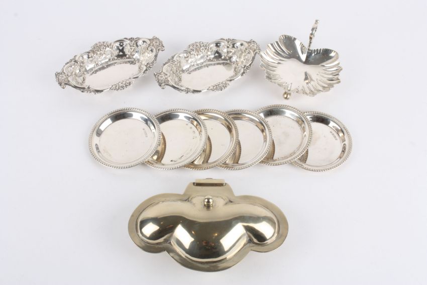 A Modern set of six silver coasters, Sheffield 1992of circular form with beaded border, Carr's of Sheffield Ltd, together with two silver pieced navette shaped small sweet meat dishes, Chester 1926, George Nathan & Ridley Hayes, a silver trinket dish, Sheffield 1905, with finger hole handled above leaf shaped dish upon ball supports, Mappin & Webb London and a silver-plated dish with cover(10) weight 10 oz approx.Condition: Good condition with wear to each item