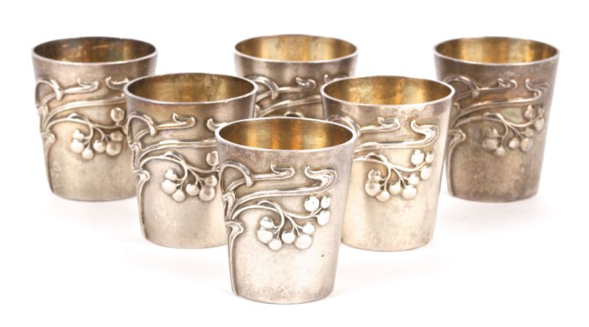 A good set of six silver gilt Art Nouveau shot cups,hallmarked, possibly Canadian 1890-1910, of conical tapering form with a foliate tendril on the body, marks to base 925 and LW intertwined in a shield, (6) weight 5 ozt approxCondition: Good clean condition with marks to base. Hallmarks to base appear to be pseudo London marks but these are probably Canadian.