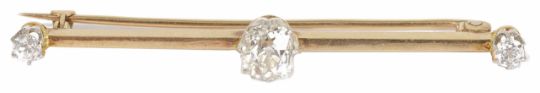 An Edwardian diamond set bar broochwith an oval old cut diamond to centre, flanked by single diamonds to either end, yellow metal mount (tests for gold) measures approx. 5.3 cm across, centre stone approx. 0.75 ct.Condition: Overall good