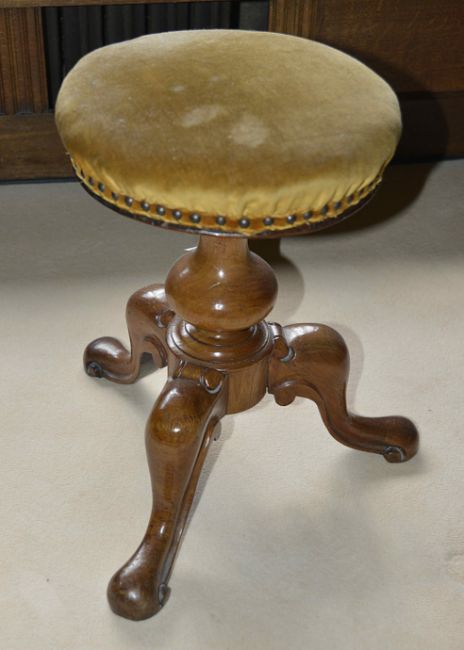 A Victorian walnut piano stool,the upholstered circular seat above bulbous support with three s-shaped supports height 50 cmCondition: Good condition with upholstery faded