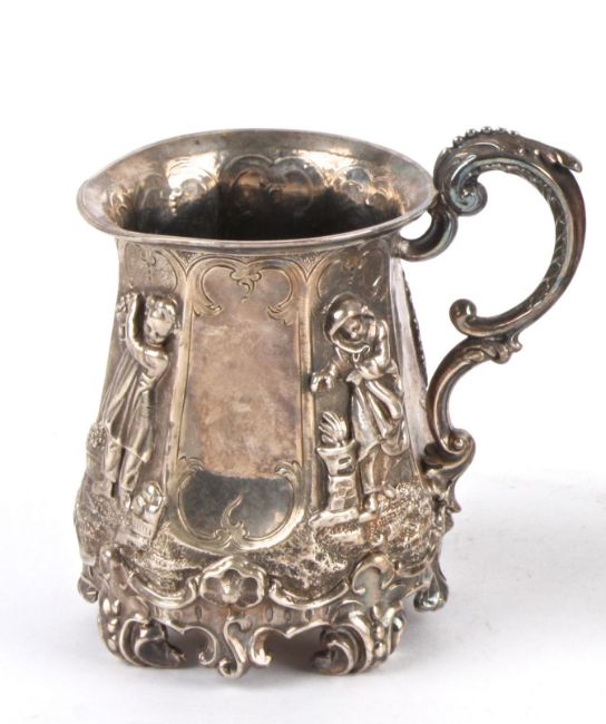 A Victorian silver tankard, London 1855 of tapering fluted form, with four applied figures, raised upon scrolled supports, James & Nathaniel Creswick weight 5 oztCondition: Good condition, wear to marksProvenance: From the estate of the late Patrick Thomas Corrie Lewin