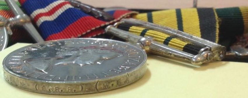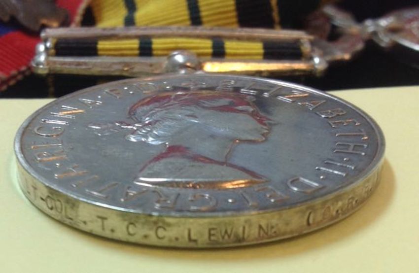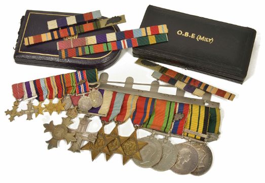 A group of eight medals WW2 and earlier awarded to Lt. Col. T.C.C. (Chippie) Lewin O.B.E., M.C., comprising O.B.E M.C 1935/49 Star, The African Star, Burma Star, Defence Medal, War Medal and Efficiency Medal, together with corresponding miniature dress bar and related ribbon bars. the O.B.E and M.C with original fitted presentation cases Thomas Chippindall Colquitt Lewin born 13/08/1907 Son of the late Brigadier-General Arthur Corrie Lewin C.B., C.M.G., D.S.O, of Cloghans, Co. Mayo (The Flying General) bar 19cm diameter Condition: Overall good for all, ribbons in tact but dirty Provenance: From the estate of the late Patrick Thomas Corrie Lewin. Thomas Chippindall Colquitt Lewin born 13/08/1907 Son of the late Brigadier-General Arthur Corrie Lewin C.B., C.M.G., D.S.O, of Cloghans, Co. Mayo (The Flying General)