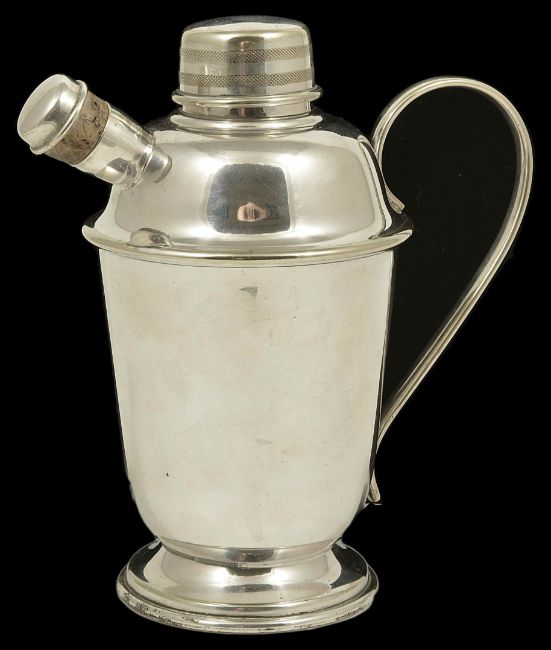 A vintage silver plated table cocktail shakerthe spout with grill, screw lid and carrying handle to side height 19 cmCondition: The cork appears to be too big and therefore needs replacing so the lid will close flush.