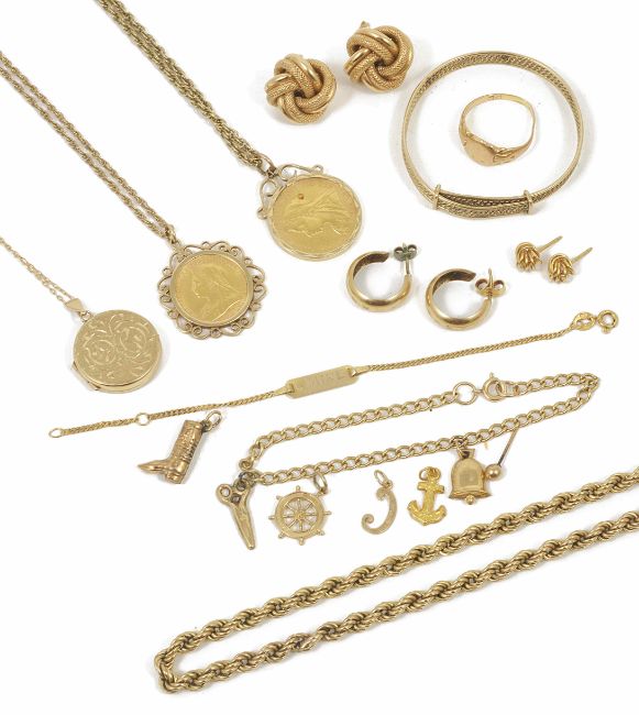 A collection of gold jewellery including a full and a half fine gold sovereignboth sovereigns in 9ct gold pendant mounts and on chains,together with a 9ct gold rope twist chain, a small 9ct gold charm bracelet and two yellow metal charms, a circular engraved 9ct locket on chain, a gold signet ring and various other 9ct gold items (qty) weight excluding one and half sovereign coins approx. 49 gms.Condition: Signet ring af, some chains a.f. suggest view in person