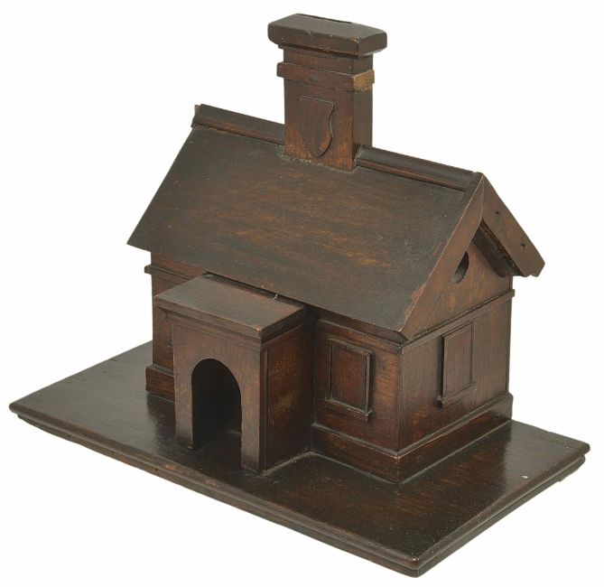 An oak novelty 'House money box', late 19th centurymodelled as a house with chimney, the chimney used as the coin slot to the inner section of the house, opening to reverse, raised upon a plinth base height 25cm x width 30.5cm x depth 17cmCondition: Good condition with wear to varnished oak, repairs to plinth base
