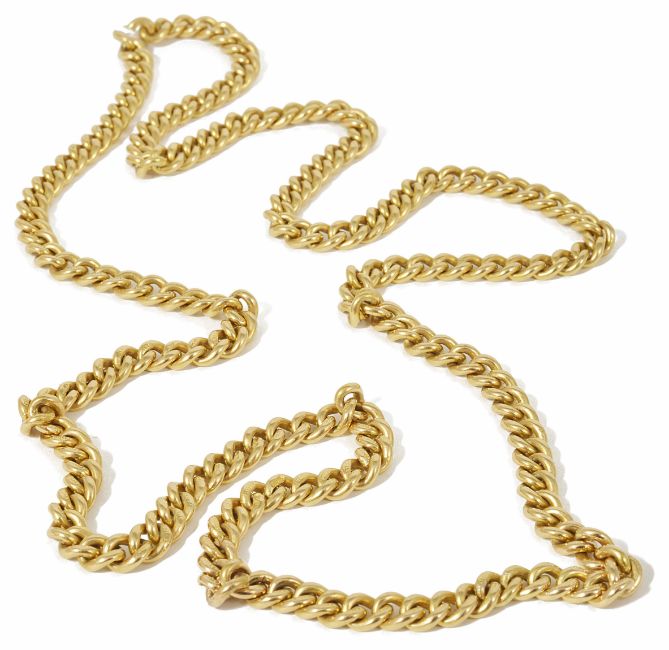 A heavy, long 18ct gold, continuous curb link chainof even size links, each link marked for 18ct. weight approx. 88.9 gm. Approx. 76cms in lengthCondition: Overall good