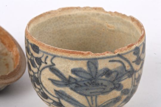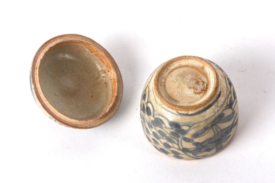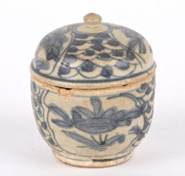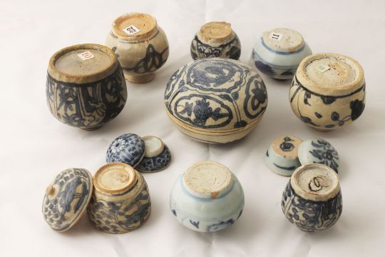 A small collection of Chinese late Ming Swatow blue and white potteryto include a small pot with painted deer panels and scrolls, a lidded domed circular box with central stylised dragon and further scroll panel decoration, a small deer painted jar, five other various small blue and white small jars, a circular box with finial lid and two small circular blue and white decorated circular boxes and covers, (11) Tallest vase is 8cm highCondition: Condition is fair to good, with wear to each item, chips to rims and crazing apparent