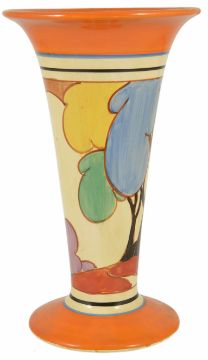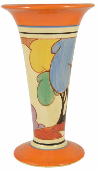 A Clarice Cliff Autumn Fantasque Bizarre trumpet vase, 20th century,painted in colours of black, mauve, blue, yellow, green, black marks to base, 279 number height 20.9 cmCondition: Condition is good with obvious wear throughout, marks to base rim