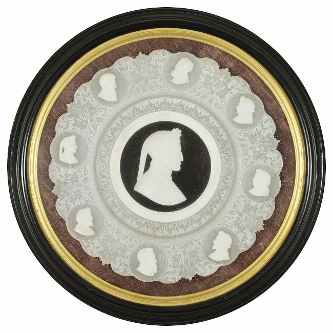 A Victorian carved alabaster plaque of nine Philosopher's profiles the scalloped edge with eight roundels with applied profiles surrounding a central profile of Dante, the plaque engraved with foliate decoration, mounted in a circular black stepped frame with gilt border diameter 35 cm; diameter framed 49 cmCondition: Good condition with wear to each of the small profiles behind the glazed frame