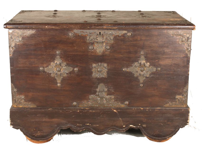 A hardwood painted coffer, 20th centuryof rectangular form with hinged lid, with applied metal strapwork and side handles, the interior with candle box, raised upon wheels covered by a hardwood apron, height 68 x 100 x 50 cmCondition: Condition fair with splitting in the wood, wear to the painted