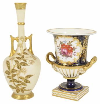 A Chamberlain Worcester twin handled pedestal urn, early 19th centurywith blue ground with colourful flower spray cartouche surrounded gilt painted decoration, gilt handles, upon pedestal square support, marks to base, together with a Royal Worcester bluish ivory twin handled vase, 20th century, green mark to base and impressed 850, (2) Royal Worcester vase 16.5 cm high; Chamberlain Worcester vase 11.5 cmCondition: Condition is good with wear to gilt areas on both vases