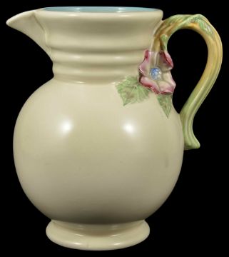 A Clarice Cliff cream ground jug,the ribbed neck above a bulbous body with circular foot ring and with floral twist handle, No.895 and printed marks to base, height 21.5cm Condition: Overall condition is good with obvious wear throughout, hairline crack to inside lip of spout