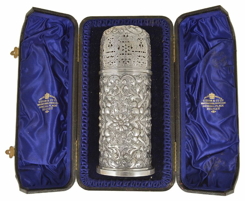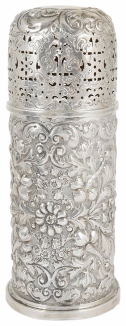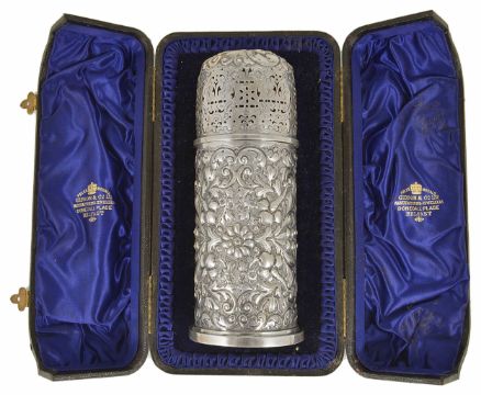 A large Victorian silver caster, London 1894of large proportions with pierced twist cover and foliate embossed cylindrical body, hallmarked, makers mark for Horace Woodward & Co Ltd, in a velvet lined cased retailer Gibson & Co Ltd Belfast, height 17.5 cm, weight 5 ozt approx.Condition: Nice condition to both caster and caseProvenance: From the estate of the late Patrick Thomas Corrie Lewin
