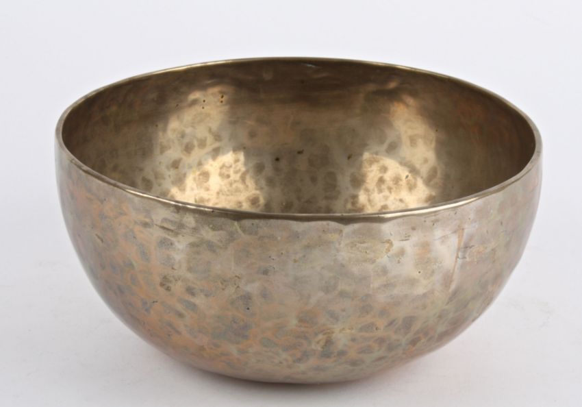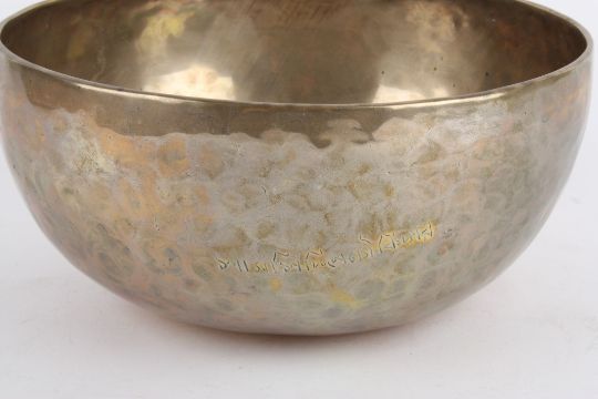 A Tibetan hammered bronze Temple singing bowl,replacement wood, pleasing tone diameter 23.5 cm, height 11 cmCondition: condition is good with obvious wear throughout