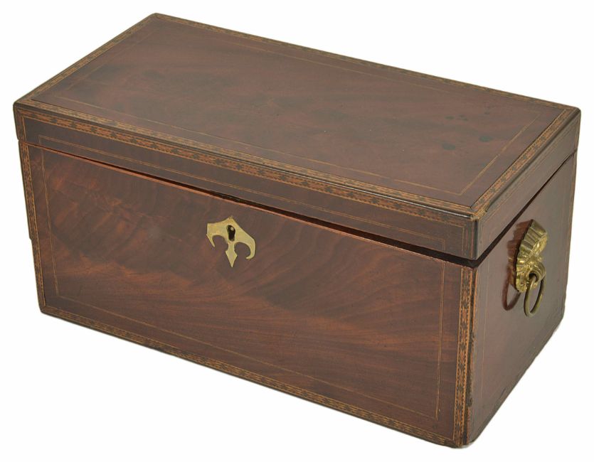 A 19th century mahogany and cross banded tea caddyof rectangular form with hinged lid and two gilt metal side handles and brass escutcheon, the interior with two hinged lidded tea caddies and central glass bowl, height 15.3 cm, width 30.7 cm, depth 15.3 cmCondition: Condition is good with obvious wear throughout the box, hinged lid slightly warped, wear to the corners of the exterior of the box, some banding missing, chip from one of the corners of the tea caddies, no key