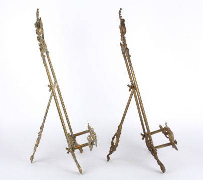 A pair of brass decorative easels, 20th centuryof typical easel form with pierced and scrolled acanthus leaf decoration upon scrolled front supports (2) height 53 cm Condition: Good condition, with wear to the brasswork